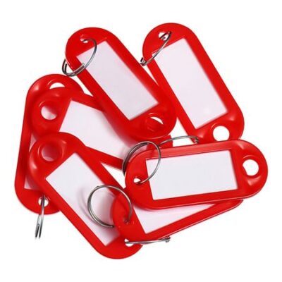Набор брелоков для ключей, 50 штук, 53 мм, цвет красный. Брелоки для ключей с информационным окном и бумажной вставкой для пометок. Размер брелока 52 х 23 мм, размер окна 36 х 18мм – предназначен для нанесения маркировки. Защитная пленка размером 18 х 36 мм из прозрачного полиэтилена служит для предохранения бумажной вкладки. Материал — мягкий пластик. Упаковка по 50 штук, цвет — красный. Корпус изготовлен из гибкого пластика, что увеличивает срок службы брелока для ключей. <ul> <li> Цвет красный.</li> <li> Материал брелока полипропилен/металл.</li> <li> Кольцо витое, стальное, хромированное.</li> <li> Диаметр кольца 15 мм.</li> <li> Количество в упаковке 50 штук.</li> <li> Упаковка единицы товара: картонная коробка.</li> <li> Наличие информационного окна: есть.</li> </ul>