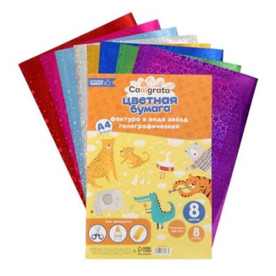 Главная » Товары для детей Набор бумаги голографической Просмотров 6 Набор бумаги голографической "Звезды" А4, 8 листов, 8 цветов, рисунок, 100 г/м2. Calligrata
