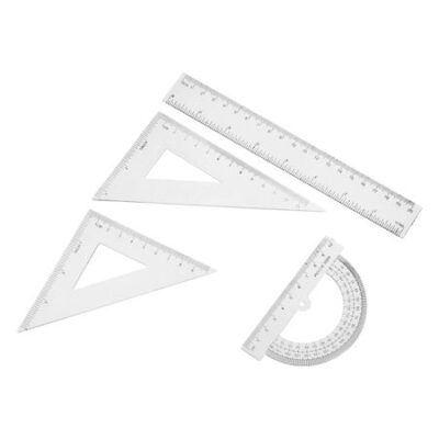 Набор чертежный, прозрачный, 4 предмета (линейка 20 см, угольник 14 см/ 30°, угольник 10 см/ 45°, транспортир). Набор геометрический предназначен для выполнения чертежных работ в процессе школьного обучения.