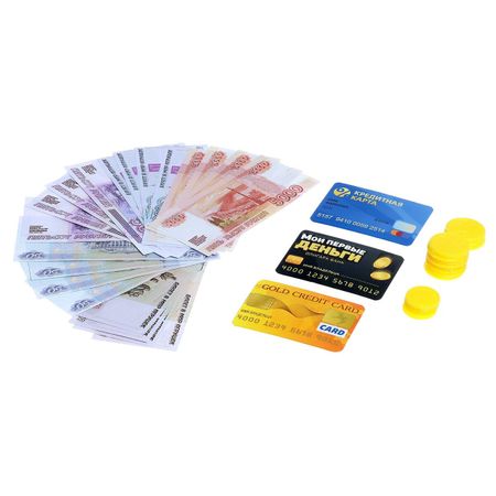 Набор денег с карточками «Мои первые деньги». Набор предназначен для настоящих юных миллионеров! Ваш малыш научится правильно считать деньги, пользоваться пластиковой картой и почувствует себя совсем взрослым. <b> Как играть?</b> <ul> <li> <b> Вариант 1</b> . В игре участвуют 2 человека. Перемешайте все деньги и на скорость разложите их в порядке возрастания. Кто справится быстрее?</li> <li> <b> Вариант 2</b> . Откройте дома настоящий магазин. Продавайте сладости, игрушки, книжки! Придумайте цены вашим товарам и раздайте игрушечные деньги всем тем, кто есть дома.</li> <li> <b> Вариант 3</b> . Сравнивайте два набора купюр и монет. Расскажите малышу, какие больше, меньше или равны между собой.</li> </ul>