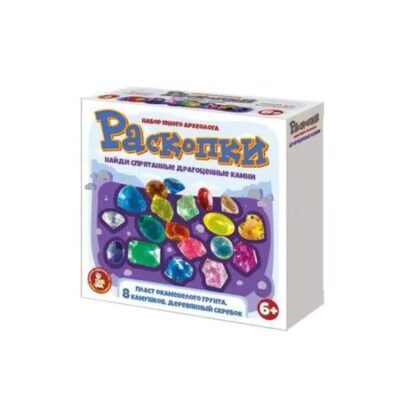Набор юного археолога для раскопок «Драгоценные камни» (8 штук). Состав игры: гипс; деревянный стек – 1 шт; драгоценные камни из пластика — 8 шт. Размер упаковки 12,5х13,5 см. Для детей старше 6 лет.