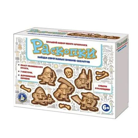 Набор юного археолога для раскопок «Воинов-скелетов». Состав игры: гипс; деревянный стек – 1 шт; фигурки воинов из пластмассы — 7 шт. Для детей старше 6 лет.