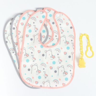 Набор детских слюнявчиков Крошка Я, 4 шт. + подарок, 29х20 см., цвет розовый, серый. Непромокаемый нагрудник подходит для крошек, которые учатся кушать самостоятельно. Одежда останется сухой и чистой, а сам малыш сохранит опрятный и аккуратный вид после приема пищи. Все края изделия обработаны, мягкий материал не натирает и не царапает нежную кожу ребенка. Товар сертифицирован и безопасен для здоровья. Для введения прикорма используйте специальное приспособление. Положите кусочки продуктов в ниблер и предложите ребенку. Аксессуар облегчит переход с каши и молока на твердую пищу.