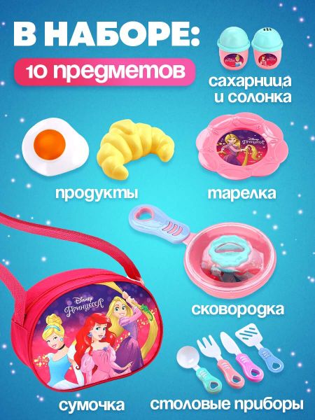 Набор детской игровой посуды «Принцессы. Волшебная посудка», в сумочке. Игровой набор посуды для девочек – это не просто игрушка, а волшебный мир ролевых игр. В удобной сумочке с изображением любимых принцесс Дисней собрано все, что нужно для кукольного чаепития. В комплекте – 10 предметов, включая посуду и продукты. <b> Особенности</b> <ul> <li> Чашки, тарелки и столовые приборы – все для сервировки стола.</li> <li> Игрушечные продукты, создающие атмосферу настоящего чаепития.</li> <li> Красочная сумочка – удобно хранить и брать с собой.</li> <li> Наклейки для декора – маленькие хозяйки смогут оформить набор по своему вкусу.</li> </ul> <b> Развиваемся играя</b> Ролевые игры помогают детям развивать воображение, коммуникативные навыки и мелкую моторику. Девочка научится сервировать стол, разыгрывать сценки и придумывать новые сюжеты. Такой набор – отличный способ познакомить ребенка с элементами этикета в игре. Легкий, компактный и удобный набор станет отличным подарком для маленькой принцессы.