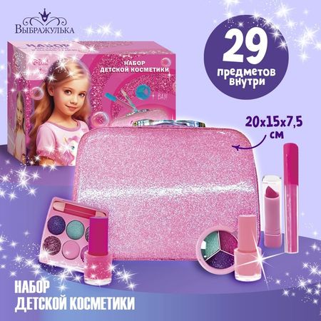 Набор косметики подарит каждой девочке невероятные эмоции!Набор состоит из 29-ти предметов!Особенности набораВсе компоненты набора детской косметики содержат минимум пигмента, берегут детскую кожу и легко смываются теплой водой.Большая кометичка обеспечит компактное и удобное хранение косметики.Что входит в набор?тени для векрезиночки для волосблески для губглиттерлаки для ногтейнаклейки на ногтипилочка и разделитель для ногтейрасчёска с зеркаломкисти для макияжакосметичкаС детской косметикой юная модница научится искусству макияжа. Детская косметика — это ещё и развивающий набор для творчества. Косметика учит сочетать цвета, развивает аккуратность, чувство меры и вовлекает в увлекательную игру всю семью.