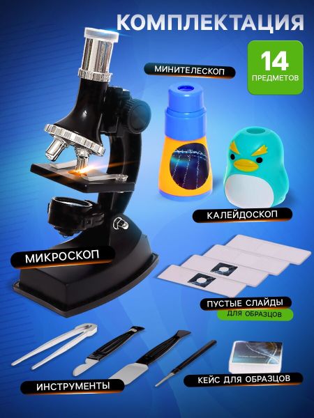 Набор для изучения микромира «Микроскоп + калейдоскоп», 14 предметов, световые эффекты, работает от батареек. <b> Мир как на ладони</b> С микроскопом серии «Эврики» малыш присоединится к невероятным экспериментам ученого Петьки, узнает секреты микромира и произведет собственные научные открытия. <b> Наблюдения начинаются</b> <ol> <li> Положите образец клетки в центр пустого слайда.</li> <li> Капните немного жидкости.</li> <li> Положите сверху бланк и выпустите оставшийся воздух.</li> <li> Используйте бумагу для впитывания лишней воды.</li> </ol> <b> Невероятные возможности</b> Качественный окуляр позволяет увеличить объект в 100, 300, 600 и 900 раз, подсветка обеспечивает хорошее качество изображения, а специальное колесико фокусировки настраивает необходимую резкость. Игры с микроскопом расширяют кругозор ребенка, развивают любознательность, внимательность и прививают тягу к знаниям. <b> В наборе:</b> <ul> <li> микроскоп;</li> <li> 4 пустых слайда;</li> <li> 2 слайда с образцами клеток;</li> <li> пинцет;</li> <li> игла;</li> <li> лопатка;</li> <li> калейдоскоп;</li> <li> скальпель.</li> </ul> В устройстве используются 2 батарейки типа АА, в комплектацию не входят. Для детей старше 8 лет.
