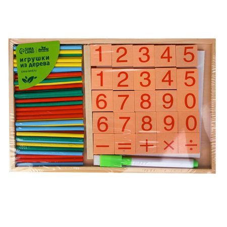 Набор для изучения счета, палочки, плашки, досочка и маркер в наборе. Набор для изучения счета содержит в себе целый комплекс игрушек, которые будут формировать логическое мышление ребенка. Доска поможет показать различные математические действия, например, сложение или вычитание: используйте плашки с цифрами и знаками, а затем пишите маркером результат. Также палочки можно использовать как счетный материал: попробуйте отсортировать их по цветам. Доска и водный маркер удобны в использовании, ведь написанное можно бесконечно стирать с помощью губки на колпачке. Деревянные квадратики подойдут для составления примеров и в качестве счетного материала. Состав набора: <ul> <li> цветные палочки,</li> <li> 25 плашек с цифрами и знаками,</li> <li> водный маркер со стирателем,</li> <li> доска.</li> </ul>