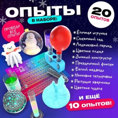 Набор для опытов «Новогодняя химия», 20 опытов. Набор для опытов «Эврики» поможет провести простые эксперименты и познакомиться со свойствами различных химических элементов. Ребенок сам проведет 20 опытов и удивит друзей! <b> Список опытов</b> <ol> <li> Новый год на других планетах.</li> <li> Белый медведь.</li> <li> Химическая грелка.</li> <li> Загадка северного сияния.</li> <li> Новогоднее послание.</li> <li> Цветные чудеса.</li> <li> Химическое противостояние.</li> <li> Новогодние искры.</li> <li> Согретый теплом.</li> <li> Искусственный снег.</li> <li> Ёлочная игрушка.</li> <li> Сказочный сад.</li> <li> Ледниковый период.</li> <li> Цветное пламя.</li> <li> Зимний конструктор.</li> <li> Праздничный фонтан.</li> <li> Заколдованные змейки.</li> <li> Неоновые татуировки.</li> <li> Растущие зверюшки.</li> <li> Волшебный воздушный шарик.</li> </ol>