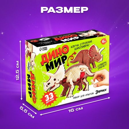 Набор для опытов «Диномир: Трицератопс», строение тела динозавра, 33 детали. Набор для опытов «Диномир: Трицератопс» поможет погрузиться в мир эпохи динозавров, изучить строение тела травоядного зверя, и потренировать мелкую моторику, память и мышление. <b> Особенности</b> <ul> <li> Из 33 детализированных элементов ребенок соберет модель трицератопса и поиграет с ней.</li> <li> Со скелетом и внутренними органами динозавра, юный ученый сделает много удивительных открытий в области анатомии!</li> <li> В комплекте есть подставка для фигурки, рамка с изображением зверя и подробная инструкция по сборке конструктора.</li> </ul> <b> Несколько интересных фактов о трицератопсе:</b> <ul> <li> Трицератопс был одним из самых крупных рогатых динозавров, достигавший веса до 12 тонн.</li> <li> Все четыре лапы были толстые как столбы. Передние лапы были мощнее задних, так как на них держался вес массивной головы и костяного воротника.</li> <li> Передвигаться зверь мог со скоростью до 40 км/ч.</li> <li> Несмотря на свои рога и грозный вид, трицератопс был травоядным и питался травяными растениями.</li> <li> Ученые считают, что трицератопс мог издавать звуки, подобные бычьему мычанию.</li> </ul> Набор рекомендован детям от 6 лет.