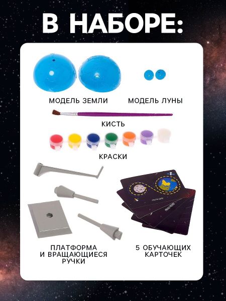 Набор для опытов «Земля и Луна». Набор для создания модели Земли и Луны — это увлекательный способ познакомить детей с основами астрономии. С его помощью ребенок сможет собрать собственную 3D-модель нашей планеты и ее спутника, изучая рельеф и материки Земли. <b> Преимущества набора</b> <ul> <li> Развитие интереса к науке и космосу.</li> <li> Стимуляция творческого мышления и воображения.</li> <li> Улучшение мелкой моторики и навыков конструирования.</li> </ul> <b> Комплектация</b> <ul> <li> Детали для сборки 3D-модели Земли и Луны.</li> <li> Набор красок из 7 цветов и кисточка для раскрашивания.</li> <li> Пять обучающих карточек с интересными фактами о планетах.</li> </ul> <b> Рекомендации по использованию</b> Набор предназначен для детей от 4 лет и старше. Совместная работа с родителями сделает процесс сборки еще более увлекательным и познавательным. Готовая модель станет отличным дополнением детской комнаты или учебного уголка. Подарите ребенку возможность прикоснуться к тайнам космоса и развить свои навыки с помощью этого набора для создания модели Земли и Луны!