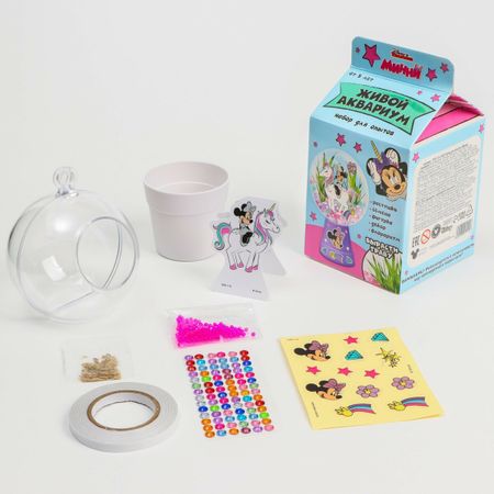 Набор для опытов «Чудесный флорариум», Минни Маус. Ребенку обязательно понравится делать свой флорариум, ведь ему предстоит собрать настоящую поделку, украсить ее, вырастить шарики с гидрогелем, а также посадить настоящую траву и наблюдать за ее ростом в прозрачном гидрогеле. <b> Как сделать флорариум</b> <ol> <li> Украсьте подставку и аквариум наклейками и стразами. Затем с помощью двусторонней липкой ленты закрепите аквариум на подставке.</li> <li> Возьмите подходящую емкость, засыпьте шарики-растушки, залейте водой в соотношении 1:1 и оставьте на 4–6 часов.</li> <li> Поместите в аквариум готовые растушки и декор. Распределите семена по поверхности шариков и спрысните их водой.</li> <li> Поместите аквариум на окно или под искусственное освещение. Через несколько дней семена прорастут.</li> </ol> <b> Что в наборе:</b> <ul> <li> флорариум;</li> <li> подставка;</li> <li> семена;</li> <li> шарики орбиз;</li> <li> фигурка с Минни-Маус;</li> <li> декор;</li> <li> двусторонняя клейкая лента.</li> </ul> Набор рекомендован для детей от 5 лет.