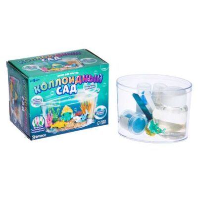 Набор для опытов «Коллоидный сад», с крутыми рыбками. Если вы слышали про химические, коллоидные или силикатные сады, то этот набор точно для вас. А если не слышали — тем более! В наборе «Коллоидный сад» вы найдете баночку, фигурку и остальные компоненты для проведения опыта. <b> Как вырастить сад</b> <ol> <li> Прикрепите фигурку ко дну баночки с помощью двусторонней клейкой ленты.</li> <li> Украсьте дно по своему вкусу и желанию ракушками из набора.</li> <li> Добавьте в силикатный клей щепотку красителя, чтобы он окрасился только слегка, хорошо перемешайте.</li> <li> Затем добавьте воду в соотношении 1:4 (одна часть клея на четыре части воды), тщательно перемешайте, у вас получится полупрозрачный раствор.</li> <li> Добавьте несколько белых и голубых кристаллов в раствор. Не перемешивайте! </li> <li> Дно стакана должно остаться не полностью заполненным. Оставьте в покое коллоидный сад на 1,5‒2 часа.</li> <li> По истечении этого времени у вас вырастет собственный коллоидный сад! <b> ВАЖНО! Не опускайте руки в раствор!</b> </li> </ol> Если у вас получился слишком темный и непрозрачный раствор, то сначала дождитесь, когда вырастет ваш сад, а затем слейте аккуратно раствор, оставив все игрушки и водоросли в банке. <b> Вы можете оставить содержимое банки без раствора или долить окрашенную воду.</b>