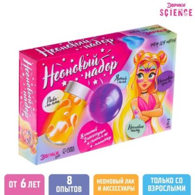 Набор для опытов «Неоновый набор», 8 опытов. Набор для опытов «Неоновый набор» ребенок проведет 8 интересных экспериментов, в результате которых у малышки появятся необычные игрушки. А также сделает красивый макияж и необычный маникюр. <b> Какие опыты вас ждут:</b> <ol> <li> Лава-лампа.</li> <li> Удивительные животные.</li> <li> Яркий мячик.</li> <li> Магия вулкана.</li> <li> Ручка для рисования светом.</li> <li> Светящаяся палочка.</li> <li> Неоновые тату.</li> <li> Магические фигурки.</li> <li> Удивительный макияж.</li> </ol> <b> Особенности набора</b> <ul> <li> В комплекте есть инструкция.</li> <li> Все компоненты набора безопасны и безвредны для детей.</li> <li> В коробке уже есть абсолютно все, что понадобится для эксперимента.</li> </ul> <b> Увлекательно и полезно</b> Занимательные эксперименты помогут развить мышление, логику и воображение, привить стремление проникать в суть вещей и пробудят желание открывать новое. Набор предназначен для детей старше 6 лет.