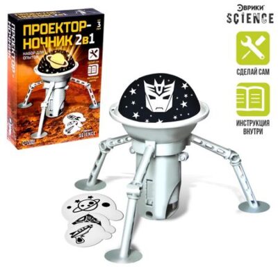 Набор для опытов 2 в 1 «Проектор-ночник». Проектор-ночник 2 в 1 «Трансформеры» поможет ребенку превратить свою комнату в настоящий планетарий. При сборке ночника, который выглядит как космический корабль, ребенок поймет принцип работы светильника. Ночник превращается в проектор, так что малыш сможет погрузиться в мир звезд с любимыми героями! <b> Как играть</b> <ol> <li> Соберите игрушку согласно инструкции из набора.</li> <li> Чтобы использовать изделие как ночник, вставьте в него 1 большой слайд.</li> <li> Если вы хотите использовать ночник в качестве проектора, вставьте в него один из маленьких слайдов.</li> <li> Нажмите на кнопку включения в нижней части и посветите им на стену.</li> <li> Наслаждайтесь захватывающими картинками!</li> </ol> Для работы необходимы 2 батарейки типоразмера AG13 (входят в комплект). Игрушка рекомендована детям от 6 лет.