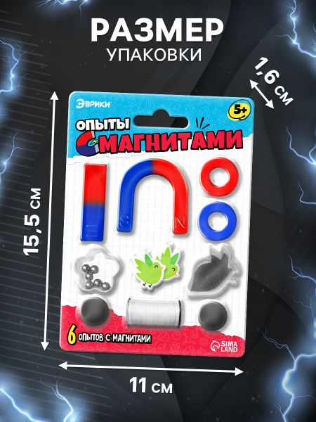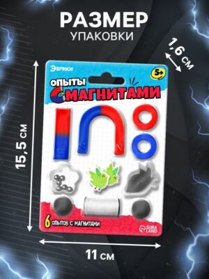 Набор для опытов «Опыты с магнитами», 6 опытов. Набор «Опыты с магнитами» знакомит с основными законами физики. Набор помогает отвлечься от гаджетов и провести время с пользой и удовольствием. Ребенок проведет 6 увлекательных опытов, узнает принцип работы магнита, научится работать с материалами, следовать инструкциям и проводить самостоятельные исследования. <b> Комплектация</b> <ul> <li> 6 магнитов.</li> <li> Катушка ниток.</li> <li> Металлические шарики.</li> <li> Металлическая стружка.</li> <li> Бумажные карточки.</li> </ul> <b> Развиваемся, играя</b> Набор подходит для домашнего использования, школьных проектов и совместных занятий с родителями. Впечатляющие демонстрации магнитных эффектов вызывают восторг и стимулируют желание узнать больше об окружающем мире. Проведение опытов позволяет превращает сложные научные концепции в доступные и понятные явления. Это помогает ребенку быстрее понимать и усваивать новую информацию.