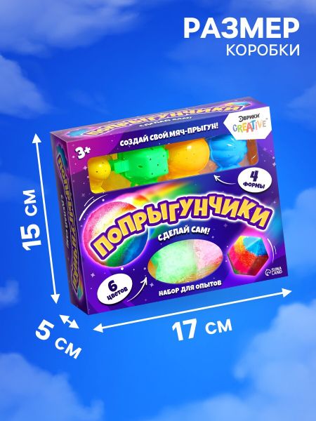Набор для опытов «Попрыгунчики», 4 формы, 6 цветов. Преврати игру в научное открытие! Набор для химических экспериментов «Попрыгунчики» — это увлекательный способ познакомиться с наукой. Создавай разноцветные упругие прыгучие шарики. <ul> <li> 4 формы для лепки: в наборе встречаются разные контуры. С ними легко придумывать новые идеи и создавать уникальные попрыгунчики.</li> <li> 6 ярких цветов: кристаллы для опытов окрашены в насыщенные оттенки. Материал безопасен и приятен на ощупь.</li> <li> Простой химический процесс: дети учатся смешивать компоненты, заливать массу в формы и ждать результата. Это первый шаг к пониманию реакций и состава веществ.</li> <li> Инструкция в комплекте: все этапы подготовки и проведения опыта показаны понятно и пошагово. Родителям легко контролировать процесс, малышам — следить за изменениями.</li> </ul> Наука без сложностей: эксперименты рассчитаны на дошкольников и младших школьников. Они развивают внимание, моторику и интерес к естественным наукам.