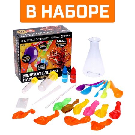 Набор для опытов «Увлекательная наука», 10 опытов с лабораторной посудой. С набором для опытов «Эврики» ребенок узнает об удивительных свойствах химии, проведет 10 увлекательных экспериментов дома и удивит своих друзей. Сначала все процессы покажутся настоящими чудесами и фокусами, но на самом деле все происходящее легко объясняется законами природы. <b> В комплект входят следующие опыты:</b> <ol> <li> «Молочный художник»;</li> <li> «Лава-лампа»;</li> <li> «Шпионское послание»;</li> <li> «Четыре этажа сахара»;</li> <li> «Радуга в пробирке»;</li> <li> «Как надуть шарик, не прикасаясь к нему?»;</li> <li> «Греет ли шуба?»;</li> <li> «Танец хлопьев»;</li> <li> «Вулкан»;</li> <li> «Газировка».</li> </ol>