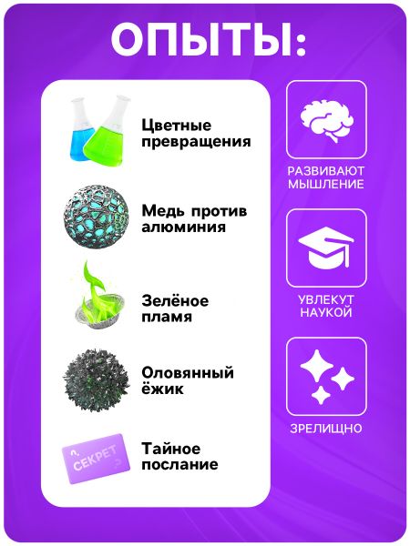 Набор для опытов «Борьба металлов», 4+1 опытов. Набор для опытов «Эврики» познакомит ребенка с удивительными химическими реакциями и позволит провести 5 увлекательных экспериментов! <b> Опыты</b> <ol> <li> Цветные превращения.</li> <li> Медь против алюминия.</li> <li> Зеленое пламя.</li> <li> Оловянный ежик.</li> <li> Тайное послание.</li> </ol> Следуйте инструкции и готовьтесь удивляться! <b> Увлекательно и полезно!</b> В ходе экспериментов ребенок понаблюдает за противостоянием между медью и алюминием, вырастит оловянного ежика, получит зеленое пламя и изучит химическое взаимодействие с быстрой сменой цвета раствора. В набор входит все необходимое для выполнения опытов. Набор для опытов предназначен для детей старше 5 лет. Дети должны проводить опыты только под присмотром взрослых.
