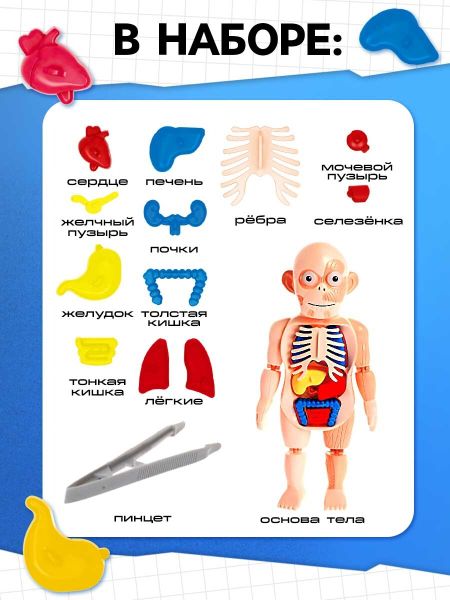 Набор для опытов «Мое удивительное тело». Набор для экспериментов «Мое удивительное тело» станет отличным подарком для детей, интересующихся анатомией и функциями человеческого организма. Этот увлекательный комплект поможет юным исследователям узнать, как работают органы и системы тела, через практические опыты и эксперименты. <strong> Что входит в набор</strong> <ul> <li> Подробное руководство с пошаговыми инструкциями.</li> <li> Безопасные материалы и инструменты для проведения опытов.</li> <li> Интерактивные элементы для наглядного изучения анатомии.</li> <li> Дополнительные ресурсы для углубления знаний.</li> </ul> <strong> Преимущества</strong> <ul> <li> Развивает интерес к науке и медицине.</li> <li> Способствует развитию логического мышления и любознательности.</li> <li> Подходит для индивидуальных и групповых занятий.</li> <li> Безопасные и качественные компоненты, соответствующие стандартам.</li> </ul> <strong> Рекомендации по использованию</strong> Набор рекомендуется для детей от 4 лет. Он идеально подходит для домашних занятий, школьных проектов или внеклассных мероприятий. Под присмотром взрослых дети смогут проводить эксперименты, изучая строение и функции различных систем организма. Подарите ребенку возможность стать настоящим исследователем и узнать все тайны человеческого тела с помощью этого набора для экспериментов!