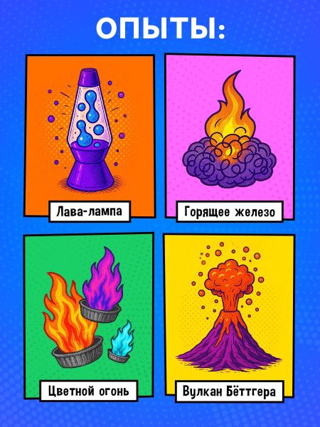 Набор для опытов «Наука в комиксах», 11 опытов. С набором для опытов «Наука в комисксах» ребенок проведет 11 увлекательных экспериментов и познакомится с удивительным миром химии и физики. В наборе вы найдете забавные истории, на которых подробно описан ход действий. Отправляйтесь вперед к научным открытиям вместе с героями комикса! <b> Какие опыты вас ждут:</b> <ol> <li> Горячее железо.</li> <li> Лава-лампа.</li> <li> Тайное послание.</li> <li> Шагающая радуга.</li> <li> Цветной огонь.</li> <li> Коралловый риф.</li> <li> Фараоновы змейки.</li> <li> Башня плотности.</li> <li> Вулкан Беттгера.</li> <li> Цветные превращения.</li> <li> Битва металлов.</li> </ol> <b> Особенности набора</b> <ul> Каждый опыт сопровождает красочная инструкция в стиле комикса с подробным описанием каждого шага и объяснением реакции. <li> Все компоненты набора безопасны и безвредны для детей.</li> <li> В коробке уже есть абсолютно все, что понадобится для эксперимента.</li> </ul> <b> Увлекательно и полезно!</b> Занимательные эксперименты помогут развить мышление и логику, привить стремление проникать в суть вещей и пробудят желание открывать новое. В ходе экспериментов ребенок узнает много интересного о различных веществах и их взаимодействии друг с другом. Набор для опытов предназначен для детей старше 5 лет. Дети должны проводить опыты только под присмотром взрослых.