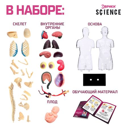Набор для опытов «Строение тела», беременная женщина. Организм человека — сложная и невероятно интересная система. С этим набором вы сможете наглядно объяснить ребенку, как выглядит каждый орган и как протекает процесс беременности. Изучайте удивительный процесс зарождения жизни вместе с «Эврики»! <b> В комплекте:</b> <ul> <li> череп,</li> <li> нижняя челюсть,</li> <li> трахея,</li> <li> гортань,</li> <li> грудина,</li> <li> грудная клетка,</li> <li> молочные железы,</li> <li> молочные протоки,</li> <li> диафрагма,</li> <li> печень,</li> <li> матка,</li> <li> плод (размер: 5,3 × 3 × 2,8 см) ,</li> <li> позвоночник,</li> <li> лопатки,</li> <li> почки,</li> <li> таз,</li> <li> крестец,</li> <li> сердце,</li> <li> мозг,</li> <li> легкие,</li> <li> желудок,</li> <li> толстый кишечник,</li> <li> тонкий кишечник,</li> <li> прозрачная основа макета тела,</li> <li> подставка,</li> <li> брошюра на русском языке.</li> </ul> Набор рекомендован для детей от 6 лет.