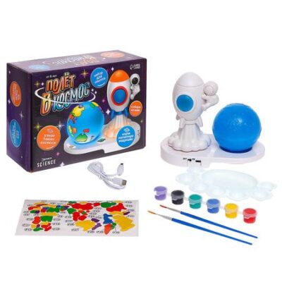 Набор для опытов «Полет в космос», создай свой ночник. С набором для опытов «Полет в космос» ребенок соберет необычный ночник, который работает от магнитной индукции! <b> Как играть</b> Следуя подробной инструкции, выполните следующие действия: <ul> <li> соберите планету и прикрепите наклейки;</li> <li> соберите ракету и прикрепите к ней фигурку космонавта;</li> <li> раскрасьте ракету;</li> <li> включите ночник и поставьте на него планету и ракету.</li> </ul> Ночник работает от 3 батареек типоразмера АА (нет в комплекте) или от провода USB (в комплекте). <b> Как работает ночник</b> Ракету подсвечивает обычная лампочка, а вот планета светится как по волшебству. Но на самом деле здесь работает закон электромагнитной индукции! Это научное открытие позволяет передавать электричество без привычных проводов. Подробнее о наборе смотрите в видеообзоре. Для детей старше 8 лет. Комплектация<ul> <li> Планета Земля.</li> <li> Иллюминатор.</li> <li> Основа.</li> <li> Палитра.</li> <li> USB-кабель.</li> <li> Космонавт.</li> <li> Детали ракеты.</li> <li> Подставка для ракеты.</li> <li> Кисти и краски.</li> <li> Наждачная бумага.</li> </ul>