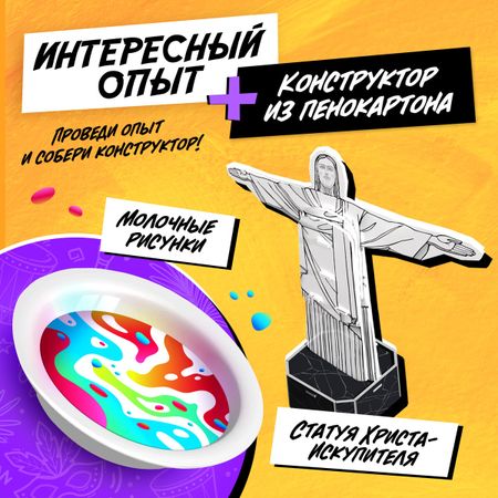 Набор для опытов «Чудеса света: Статуя Христа-Искупителя». С набором для опытов «Чудеса света: Статуя Христа-Искупителя» ребенок своими руками соберет модель главной достопримечательности Рио-де-Жанейро и Бразилии, узнает интересные факты о ней, а также проведет 2 увлекательных опыта. Для сборки конструктора не понадобится клей. Чтобы собрать модель, следите за нумерацией: вставляйте детали друг в друга цифра к цифре. <b> Опыт «Рисунки на молоке»</b> <ul> <li> Налейте молоко в чашку Петри так, чтобы жидкость полностью покрыла дно емкости.</li> <li> Поставьте с помощью красителей несколько цветных точек ближе к центру.</li> <li> Окуните палец в краску и постарайтесь не стереть ее с пальцев.</li> <li> Дотроньтесь до центра вашего «полотна», и по нему пробежится радужный шторм!</li> </ul> <b> Опыт «Научный ксилофон»</b> <ul> <li> Соберите штатив и поставьте в него 7 пробирок, которые будут вашим ксилофоном.</li> <li> Найдите дома 3 стакана. Смешайте в каждом стакане воду и разные красители.</li> <li> С помощью пипетки заполните пробирки раствором так, чтобы цвета чередовались, а количество воды росло от половины пробирки до почти полной.</li> <li> С помощью специальной палочки постучите по каждой пробирке и посмотрите, как отличаются звуки. Если плавно провести палочкой по всем пробиркам разом, то получится коротка мелодия.</li> </ul> <b> Увлекательно и полезно</b> Занимательные эксперименты помогут развить мышление и логику, привить стремление проникать в суть вещей и пробудят желание открывать новое. Играйте и развивайтесь с торговой маркой «Эврики»! Набор для опытов предназначен для детей от 5 лет. Дети должны проводить опыты только под присмотром взрослых!
