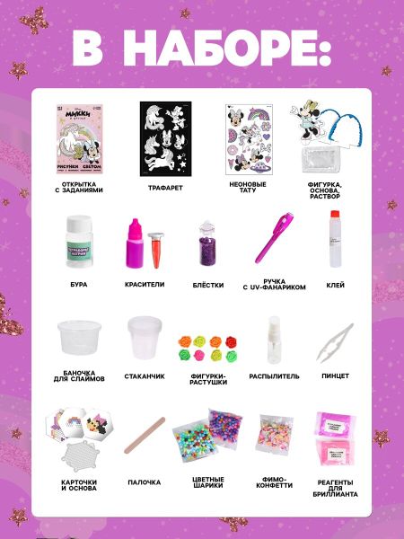 Набор для опытов «Минни Маус. Единорог», 7 опытов. С большим набором опытов «Минни Маус: Единорог» малышка проведет 7 увлекательных экспериментов в результате которых у ребенка появятся необычные игрушки. Отправляйтесь вперед к научным открытиям вместе с любимыми героями мультфильма! <b> Какие опыты вас ждут:</b> <ol> <li> Фигурки из кристаллов.</li> <li> Аквамозаики с любимыми персонажами.</li> <li> Рисунки светом.</li> <li> Лизун.</li> <li> Неоновые тату.</li> <li> Цветки-растушки.</li> <li> Бриллиант своими руками.</li> </ol> <b> Особенности набора</b> <ul> <li> В комплекте подробная инструкция.</li> <li> Все компоненты набора безопасны и безвредны для детей.</li> <li> В коробке уже есть абсолютно все, что понадобится для эксперимента.</li> </ul> <b> Увлекательно и полезно</b> Занимательные эксперименты помогут развить мышление и логику, привить стремление проникать в суть вещей и пробудят желание открывать новое. Набор предназначен для детей старше 5 лет.