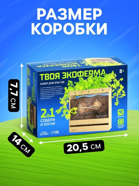 Набор для опытов «Твоя экоферма», 2 в 1. Набор для опытов «Твоя экоферма» откроет ребенку мир науки и природы. Юный ботаник посадит разные виды семян, изучит процесс роста и сравнит их особенности. <b> Особенности набора для опытов</b> <ul> <li> Подробная инструкция поможет ребенку собрать ферму и посадить семена.</li> <li> Садовый инструмент выполнен из металла, черенки из дерева.</li> <li> Детали для фермы из выполнены дерева.</li> </ul> <b> Увлекательно и полезно!</b> Набор для опытов «Твоя экоферма» упростит объяснение сложных научных концепций, сделает проведение опытов более интерактивным, увлекательным и продуктивным. Ребенок узнает больше о природе и экологии и насладится процессом исследования.