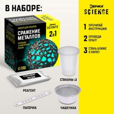 Набор для опытов «Сражение металлов». С набором для опытов «Эврики» ребенок узнает об удивительных свойствах веществ, проведет два увлекательных эксперимента и удивит друзей. Опыт «Цветные превращения» продемонстрирует способность раствора менять цвет. <b> Как сделать?</b> <ol> <li> В стаканчике смешайте одну ложку медного купороса и 2 ложки поваренной соли.</li> <li> Добавьте 30‒40 мл воды.</li> <li> Тщательно перемешайте раствор.</li> </ol> <b> Результат</b> : цвет раствора быстро сменится с голубого на зеленый. Опыт «Медь побеждает алюминий» покажет, как взаимодействуют два вещества. <b> Как сделать?</b> <ol> <li> Смастерите из фольги небольшую чашечку и установите ее в пластиковый стаканчик.</li> <li> Налейте в чашечку из фольги раствор, приготовленный в предыдущем опыте.</li> </ol> <b> Результат</b> : начнется реакция, в ходе которой в чашечке появится брешь, через которую раствор выльется на дно пластикового стакана. Набор для опытов предназначен для детей старше 4 лет. Дети должны проводить опыты только под присмотром взрослых.