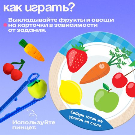 Набор для сортировки «Вкусная тарелка», по методике Монтессори, 20 заданий, 3+. Игра создана для тренировки мелкой моторики и развития мышления. Ребенок познакомится с фруктами и овощами и научится сортировать их по цвету, размеру и внешнему виду. Вместе с этой увлекательной игрой ваш малыш почувствует себя настоящим фермером! <b> Как играть?</b> <ul> <li> Попросите кроху решить примеры в пределах пяти и показать ответ на пальчиках.</li> <li> Выполните вместе с малышом задания на смекалку: помогите найти животному его любимое лакомство.</li> <li> Изучайте фигуры и размеры: разложите на тарелочке фрукты и овощи определенной формы.</li> </ul> Фантазируйте и придумайте много своих интересных заданий для развития логики малыша. В этой игре ребенок научится держать в руке пинцет и управлять им. Игра абсолютно безопасна для ребенка. Фрукты и овощи выполнены из резины, карточки — из картона, а пинцет — из пластика. <b> Дарите детям полезные игры!</b>