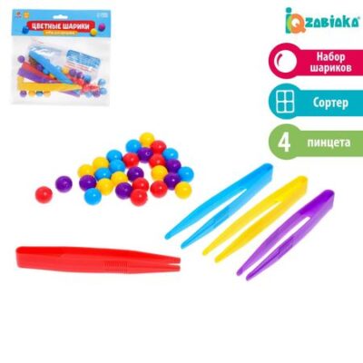 Набор для сортировки-сортер «Цветные шарики». Набор для сортировки с пинцетами и шариками надолго увлечет ребенка, поможет в развитии моторики, координации, внимания и в изучении цветов. С этим комплектом малыш быстро запомнит цвета и научится считать. <b> Как пользоваться набором?</b> <ul> <li> Помогите крохе научиться держать пинцет в ручках и цеплять им мелкие шарики.</li> <li> Попросите малыша с помощью пинцета рассортировать шарики по количеству или цветам.</li> <li> Усложняйте процесс: предложите выполнить задание на время.</li> </ul> Набор для сортировки «Цветные шарики» рекомендован детям старше 3 лет. Играть следует под присмотром родителей.