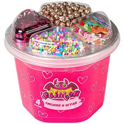 Все очень любят экспериментировать и добавлять в свои слаймы наполнители. Это стимулирует воображение и мелкую моторику, займёт ребенка на долгое время. В набор Slimer Смешай и играй входят: розовый полупрозрачный слайм, пенопластовые шарики, блестки, голографические фигурки, посыпка.