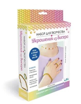 В наборе: разноцветный бисер, прозрачная леска, металлические кольца и застежки, инструкция.