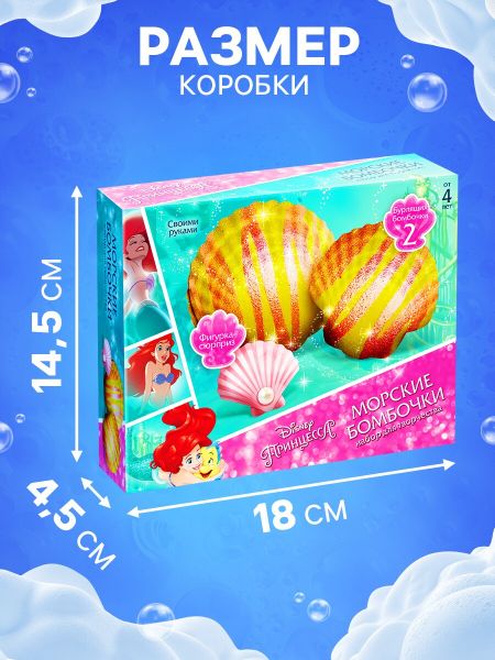 Набор для творчества «Морские эксперименты», Принцессы, Ариэль. Создай волшебные морские бомбочки с принцессой Ариэль! Набор для творчества «Морские эксперименты» — увлекательные опыты с эффектными шипящими шариками. Девочки узнают основы химии, играя с любимыми персонажами Disney. <ul> <li> 2 ароматные бомбочки: создайте шипящие шарики с морскими ароматами, которые превращают купание в волшебство.</li> <li> Полный комплект: пищевые красители, лимонная кислота, глицерин и специальные формы — все для создания настоящих морских чудес.</li> <li> Сюрприз от Ариэль: в наборе есть тематическая фигурка-сюрприз из мира Русалочки.</li> </ul> Набор развивает творческие способности и знакомит с химией в игровой форме. Все компоненты безопасны для детей от 4 лет. Идеальный подарок для маленьких поклонниц Русалочки — сочетает науку, творчество и любимых героев!