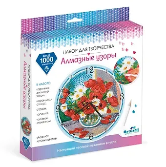 В наборе: картинка с клейкой основой диаметром 20 см, стразы (1000+), карандаш-стилус, тарелочка, часовой механизм.