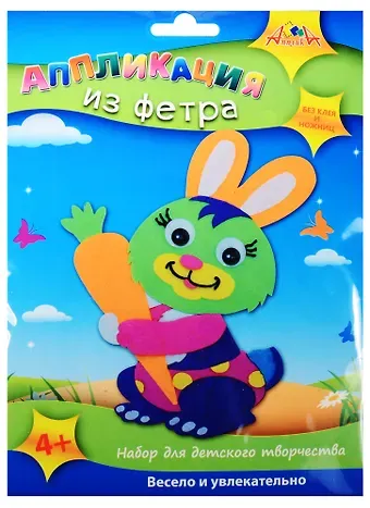 Набор для детского творчества «Аппликация из фетра» состоит из цветной картонной основы, которая высечена в виде фигурок животных, деталей из самоклеящегося фетра, декоративных глазок, картонной подставки. На картонной основе цветной рисунок, на который слоями необходимо приклеить элементы фетра соответсвующей формы и цвета, добавить глазки и приклеить подставку. Детали из фетра высечены по контуру и имеют клеевой слой, поэтому вы обойдетесь без клея и ножниц. В результате получится объемная аппликация. Занятия с помощью этого набора развивают мелкую моторику, внимание, аккуратность. Набор рассчитан на детей от 4-х лет. Упаковка — ПЭТ пакет с цветным картонным вкладышем и европодвесом, размер 170 х 230 мм.