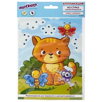 Аппликация из страз ЮНЛАНДИЯ «Котёнок» — это весёлый и занимательный способ развития мелкой моторики, аккуратности, цветового восприятия и фантазии ребёнка. Все элементы в составе самоклеящиеся, для работы не требуются ножницы и клей.