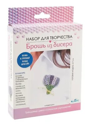 В наборе: основа из фетра с нанесенным контуром, бисер, стразы для вышивания, нитки, иголка, булавка, крепление для броши, тарелочка, инструкция.