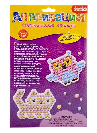 Если ребёнок любит аппликации и уже хорошо справляется с приклеиванием крупных деталей — самое время перейти на новый уровень. Для этого прекрасно подойдёт набор «Сверкающие стразы. Игрушки на магнитах». Наклеивание мелких деталей поможет ребёнку развить точность движений рук, стать более внимательным и усидчивым, а результат порадует глаз.
