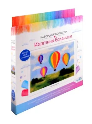 В наборе: окрашенная 100 % овечья шерсть, фетр с рисунком, иглы для валяния, губка-подложка, инструкция.