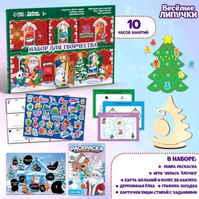 Набор для творчества надолго займёт и увлечёт ребёнка. Он создан специально для маленьких непосед. Внутри вы найдёте множество разнообразных заданий на новогоднюю тематику, которые помогут создать праздничное настроение.Занятия с наборомОтгадывайте загадки и стирайте гравюру.Украсьте деревянную ёлочку.Выполните задания на карточках «Пиши-стирай».Заполните наклейками карту желаний.Раскрасьте книгу-раскраску.Новогодний набор для творчества поможет весело и увлекательно провести праздничные дни.Любой ребёнок, который найдёт такой набор под ёлкой, останется в восторге!