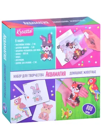 С набором Аквамагия ваш ребенок сможет создать из разноцветных бусинок 8 потрясающих фигурок в виде домашних животных и их атрибутов. Расположите картинку-шаблон под прозрачную основу так, чтобы нарисованные на шаблоне бусины совпали с углублениями на основе. Соберите фигурку по шаблону, намочите все бусины водой из пульверизатора и оставьте на 1-2 часа до полного высыхания. За это время все бусинки склеятся между собой, образовав цельную фигурку. Необыкновенная поделка готова! Такое увлекательное занятие развивает у ребёнка мелкую моторику, аккуратность, усидчивость, умение работать по образцу и творческое мышление.