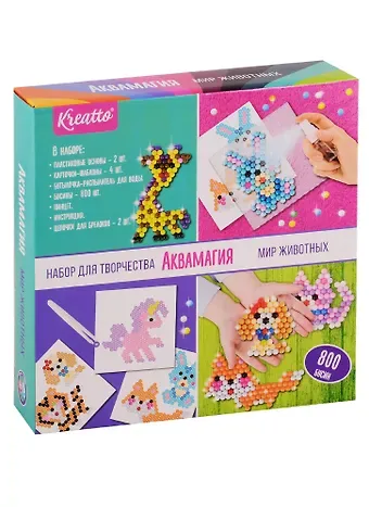 В наборе «Аквамагия. Мир животных» ТМ Kreatto 811 деталей: 800 бусин (диаметр бусин — 5 мм; каждый цвет в отдельном пакетике), 4 шаблона с цветными рисунками, 2 пластиковые основы, бутылочка-распылитель для воды, пинцет, 2 цепочки для брелоков, инструкция. Материалы: пластик, картон, металл. Товар сертифицирован. Упаковка: коробка (18 х 18 х 4 см).