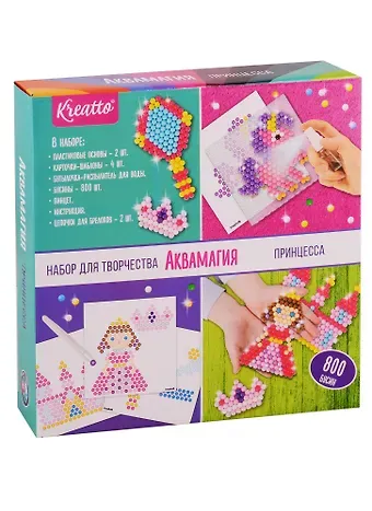 В наборе «Аквамагия. Принцесса» ТМ Kreatto 811 деталей: 800 бусин (диаметр бусин — 5 мм; каждый цвет в отдельном пакетике), 4 шаблона с цветными рисунками, 2 пластиковые основы, бутылочка-распылитель для воды, пинцет, 2 цепочки для брелоков, инструкция. Материалы: пластик, картон, металл. Товар сертифицирован. Упаковка: коробка (18 х 18 х 4 см).