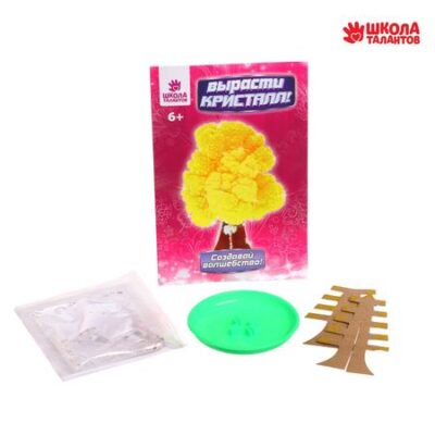 Набор для выращивания кристалла «Волшебное дерево» цвет желтый. Набор для выращивания волшебных кристаллов понравится юным любителям химических экспериментов. <b> Как провести опыт?</b> <ol> <li> Соберите фигурку, расправьте все детали и установите на подставку.</li> <li> Вылейте раствор в пластиковую подставку.</li> <li> Оставьте фигурку на несколько часов или на ночь.</li> <li> Полюбуйтесь результатом своего эксперимента.</li> </ol> Рекомендуется для детей от 6 лет.