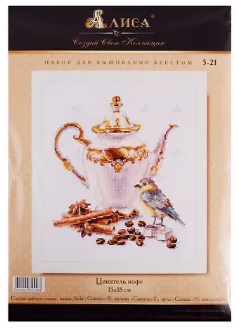 В состав набора входит: канва Аида-16,мулине, игла, инструкция, символьная схема со слабой цветовой тонировкой. Размер рисунка 15х18 см. Количество цветов 27 .