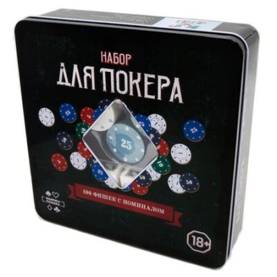 Покер — азартная и очень интересная игра, которая увлекает с первых минут даже новичков. Этот набор сочетает в себе отличное качество, прочность и долговечность материалов и стильный дизайн, он поможет вам сделать любую партию интересной и незабываемой. Все игральные фишки, а также фишка дилера и 2 колоды карт ( по 54 листа в каждой ) аккуратно уложены в красивую жестяную банку с крышкой. Банка занимает совсем немного места — не больше, чем обычная книга, ведь ее размер — всего 20х21х5см. Весь набор весит меньше килограмма, так что это отличный вариант для походов и путешествий. Набор для игры в покер — то, что нужно для отличного проведения досуга. С этим набором покер всегда под рукой! В этой компактной коробке есть всё необходимое для игры: — 100 фишек с номиналом. Номинал фишек: 1-25шт, 5-25шт, 10-25шт, 25-25шт. Сумма номиналов: 1025 — фишка дилера — 2 колоды карт