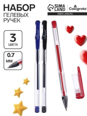Набор гелевых ручек 3 цвета, стержень синий, красный, черный, корпус прозрачный. Ручки гелевые CALLIGRATA — практичная серия гелевых ручек с колпачком на каждый день для работы в офисе и учебы. Ручка имеет прозрачный корпус. Сменный стержень длиной 128 мм со стандартным наконечником позволит использовать ручку максимально долго. Диаметр пишущего узла, равный 0,5 мм, создает линию письма, равную 0,35 мм. Набор включает гелевые ручки из 3 различных цветов чернил: синий, черный, красный. Набор гелевых ручек CALLIGRATA идеально подходит для работы с документами и выделения чего-то важного! Придайте с помощью ярких чернил своему письму уникальность и отличное настроение! Приобрести гелевые ручки CALLIGRATA можно в нашем интернет-магазине.