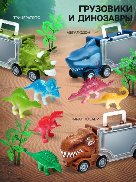 Набор грузовиков DINO, 3 шт, с динозаврами. Грузовички DINO занимаются важным делом! Они перевозят маленьких динозавров на новый остров. Задача малыша — помочь динозаврам переехать и организовать для них новый дом! <b> Особенности набора</b> <ul> <li> Размер автовозов: 16 × 4,5 × 7 см.</li> <li> Размер динозавров (средний): 6,3 × 1,9 × 3,1 см.</li> <li> Набор грузовиков DINO рекомендован для детей старше 3 лет.</li> </ul> <b> Увлекательно и полезно</b> Разнообразная техника доставит малышу радость, будет способствовать развитию пространственного и образного мышления, мелкой моторики, координации движений и эмоционального восприятия. Ни один юный гонщик не останется равнодушным!